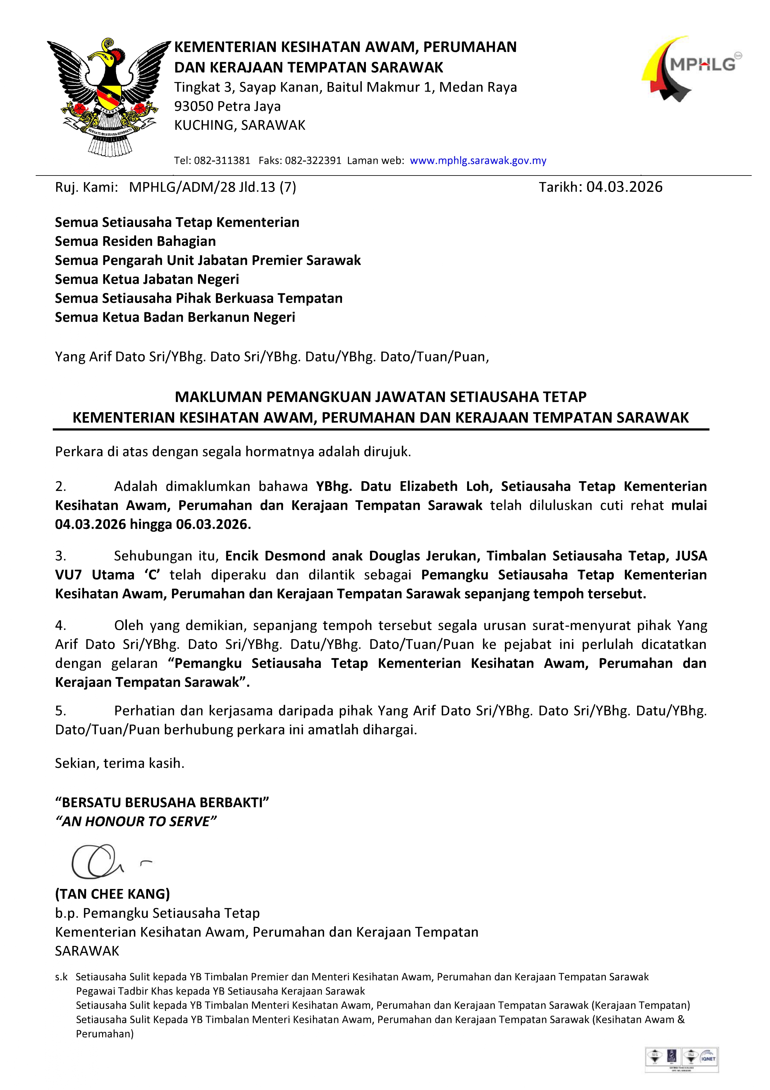 MAKLUMAN PEMANGKUAN JAWATAN SETIAUSAHA TETAP KEMENTERIAN KESIHATAN AWAM, PERUMAHAN DAN KERAJAAN TEMPATAN SARAWAK