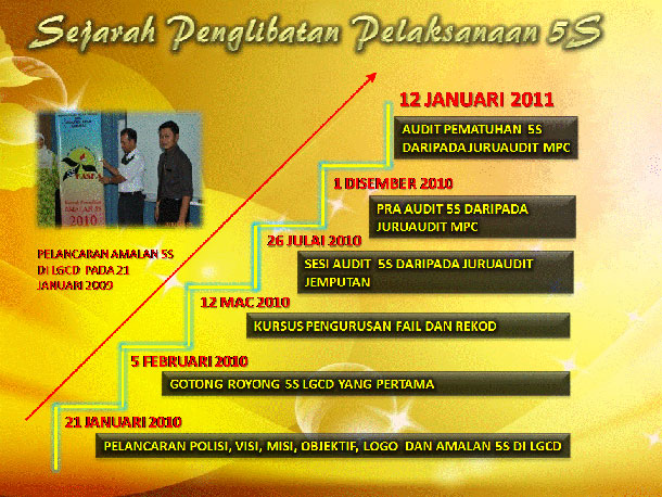 Amalan 5S iaitu sisih, susun, sapu, seragam dan sentiasa amal di letakkan pada bahagian atas membawa maksud arah sasaran LGCD yang tinggi terhadap pelaksanaannya.